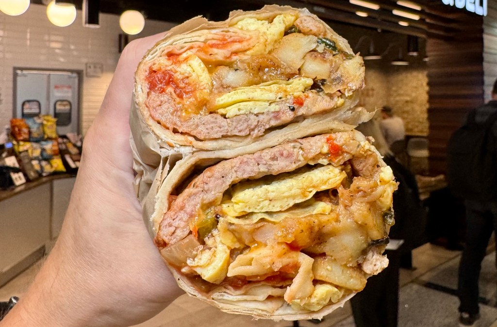 Scrambled egg, potato hash, sausage, Boar’s Head Sharp Wisconsin Cheddar cheese, and salsa wrapped in a tortilla