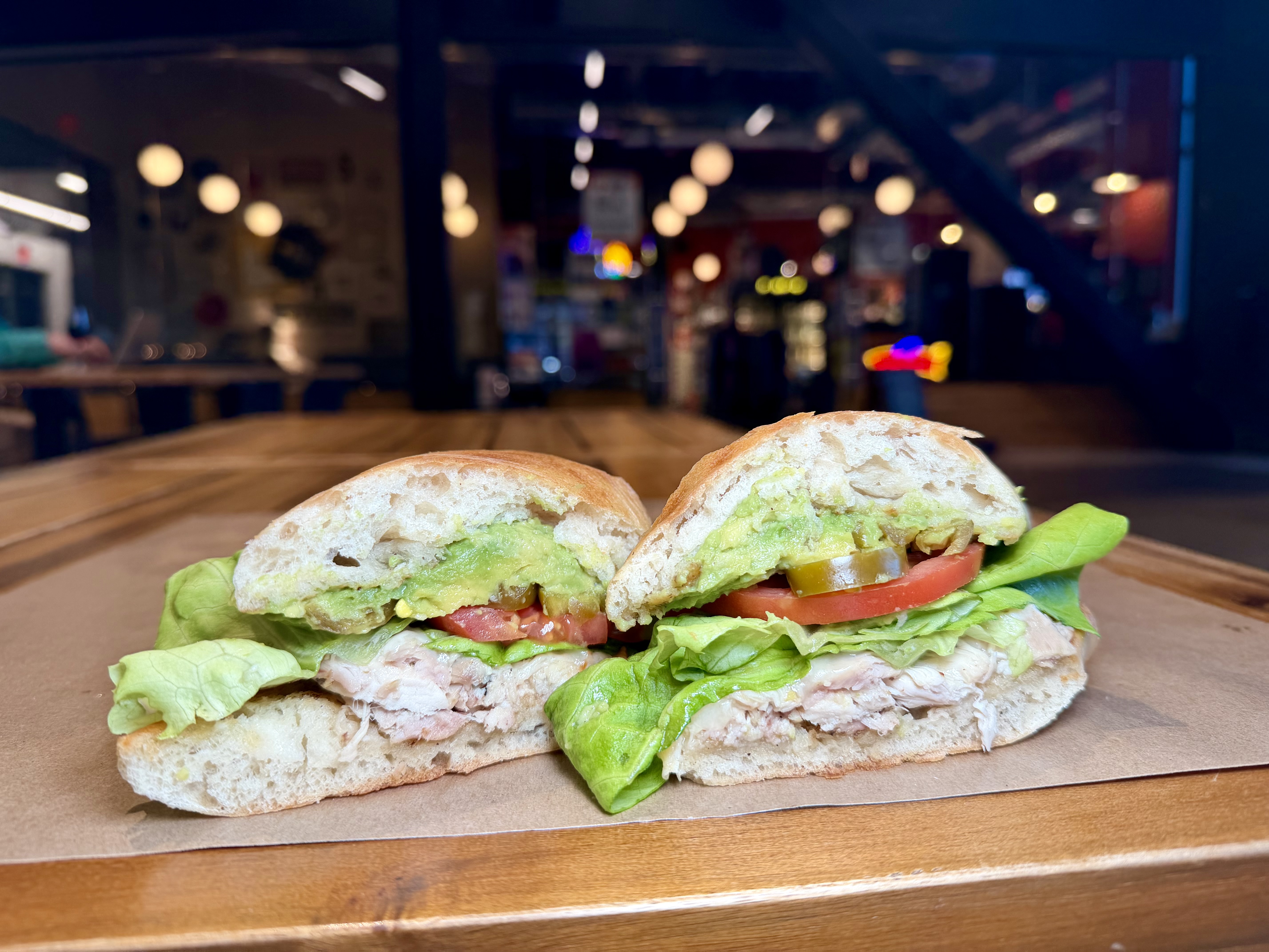 Pulled chicken, avocado, Boar’s Head Provolone, jalapeños, lettuce, tomato, and mayo on ciabatta